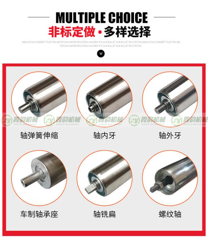 3、辊筒材质选择:碳钢镀锌、碳钢镀铬、碳钢包胶、铝合金、不锈钢、ABS等。